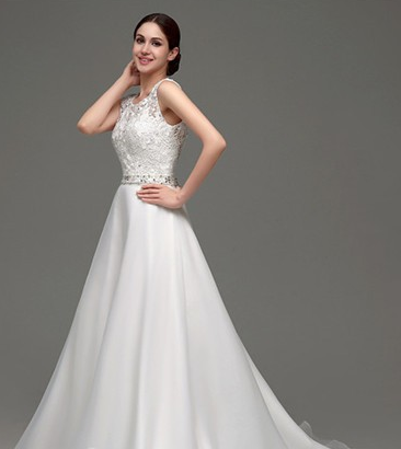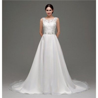 A-Line Wedding Dress Bateau Neck Low Back Organza Lace Wedding Dress With Belt
