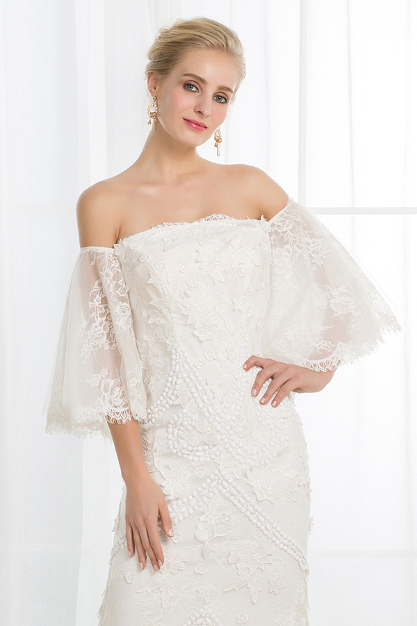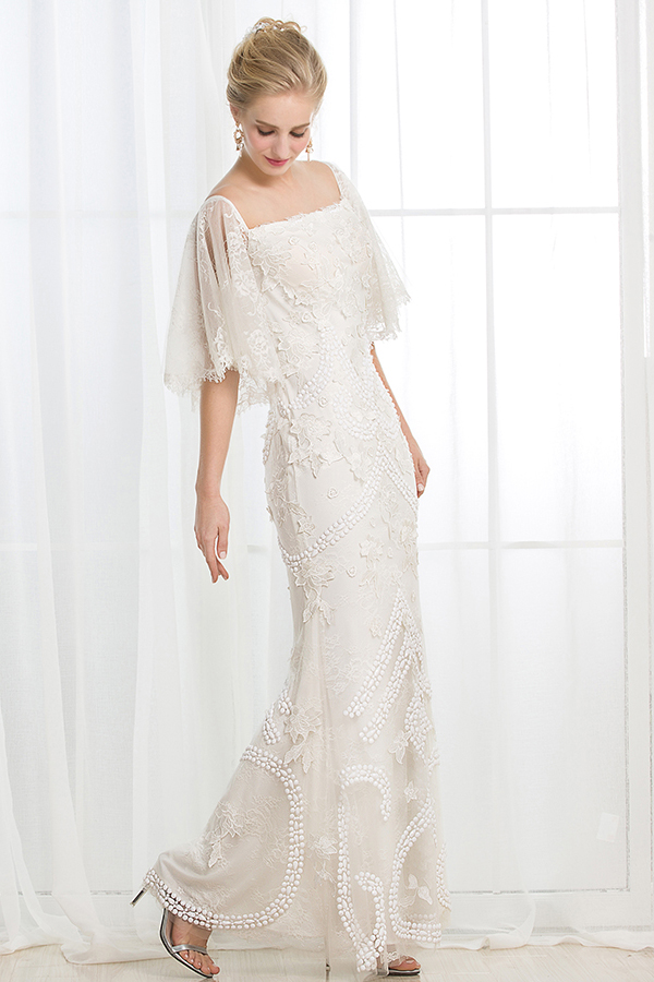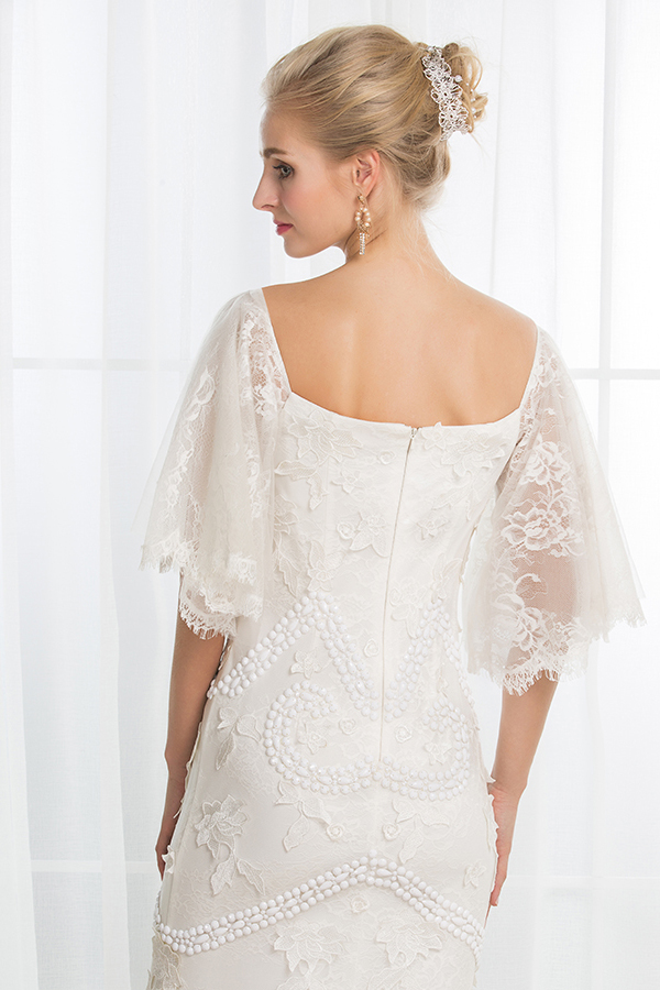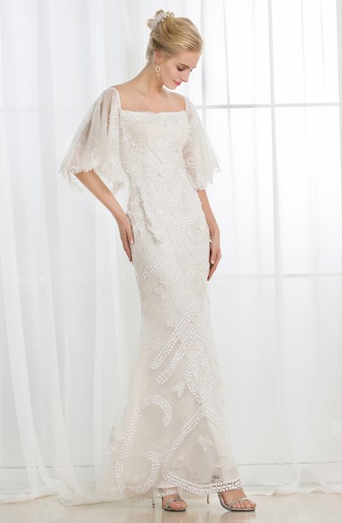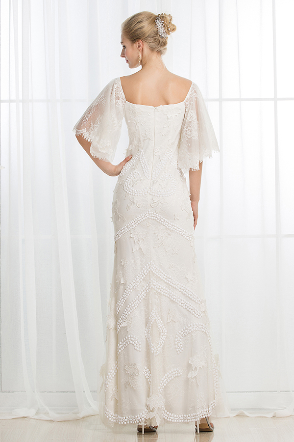 Mermaid Square Floor-Length Half Sleeves Ivory Lace Wedding Dress with Beading