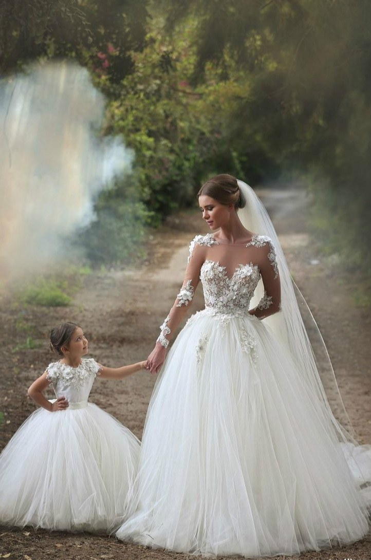 Lace Long Sleeves A-line Wedding Dresses Sheer Tulle Handmade Flowers Elegant Bridal Gowns