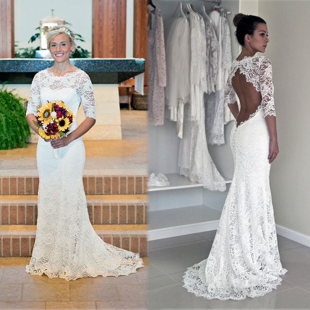 White Half Sleeve Sexy Mermaid Bridal Gown Sweep Train Trumpet Lace Wedding Dresses