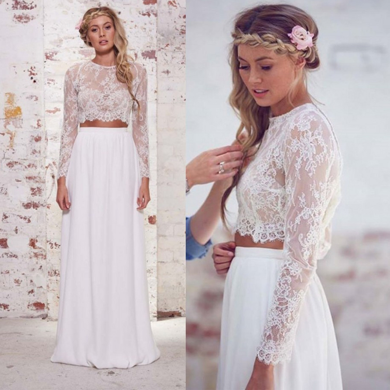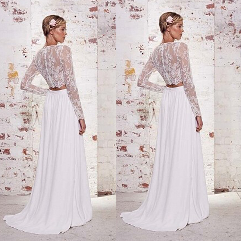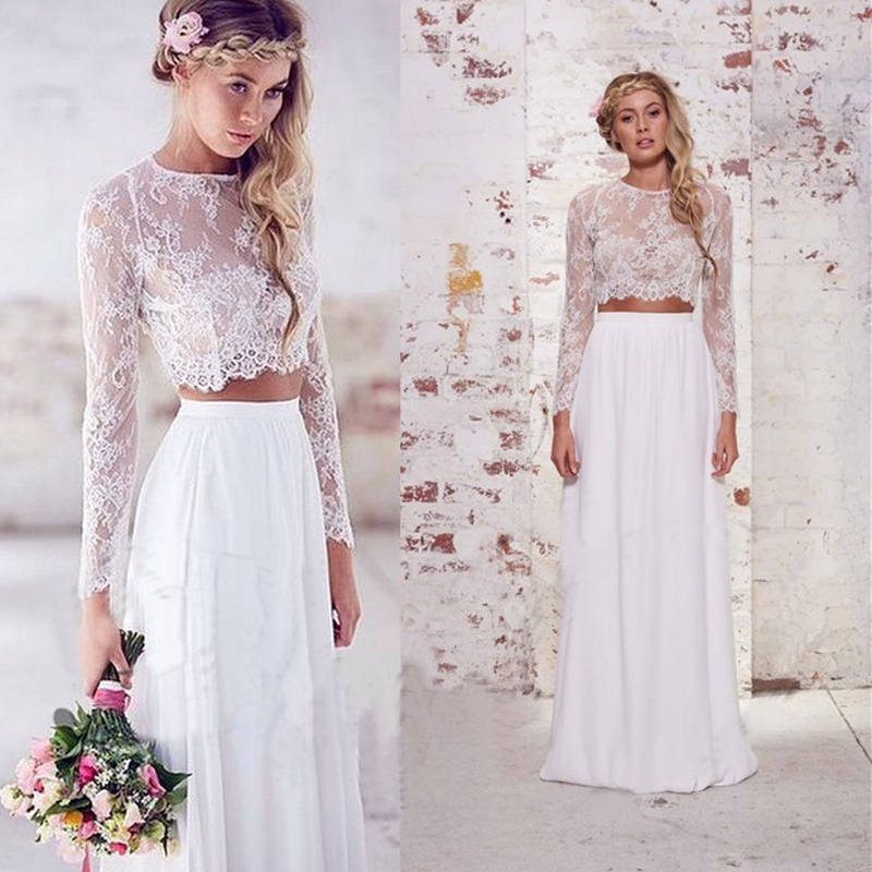 White Two Piece Lace Wedding Dress Jewel Long Sleeve Satin Floor Length Summer Beach Bridal Gowns