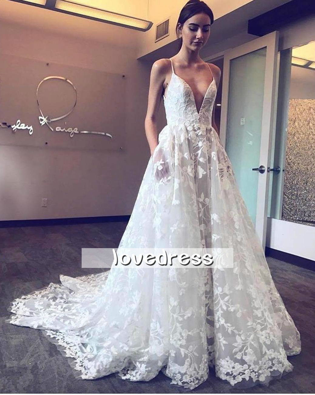 Chic Lace A-Line Wedding Dresses Spaghetti Straps Appliques Long Bridal Gowns
