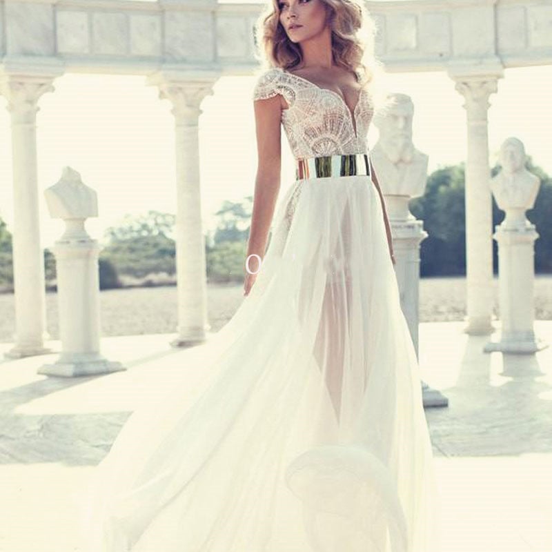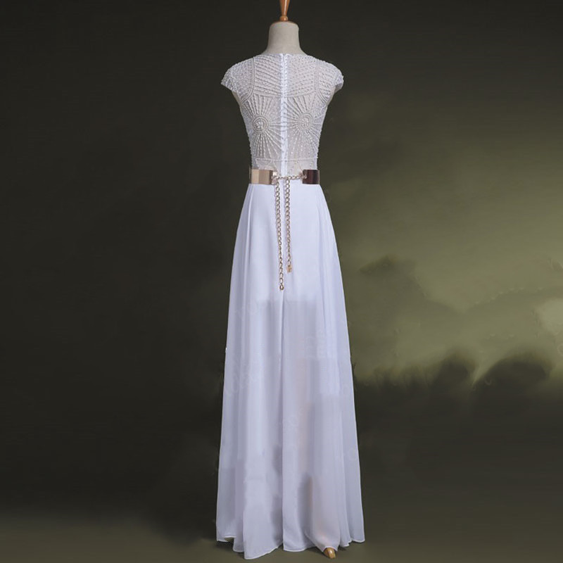 A-line Beaded Bodice Gold Sash Prom Dress Ivory Chiffon Beach Wedding Dress