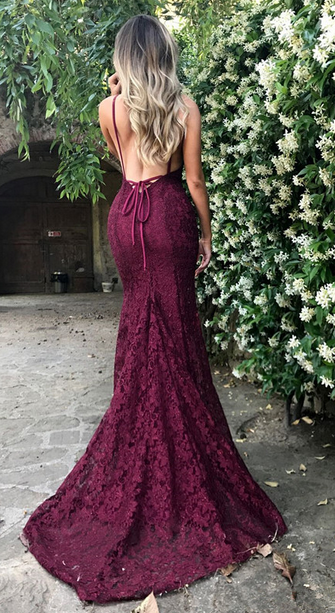 Amazing Lace Maroon Prom Dresses V-Neck Spaghetti Strap Long Evening Dress