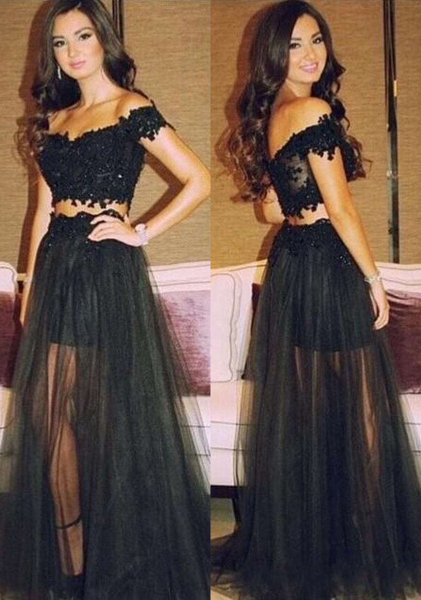 Black Lace Two Pieces Prom Dresses Off Shoulder Sheer Tulle Beaded Sexy Evening Gowns