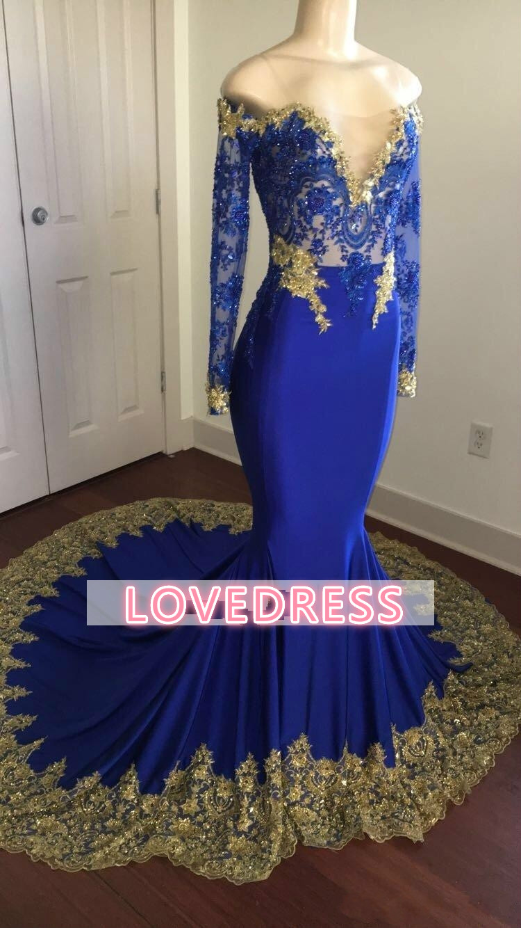 Shiny Royal Blue Prom Dresses Off-the-Shoulder Evening Gowns