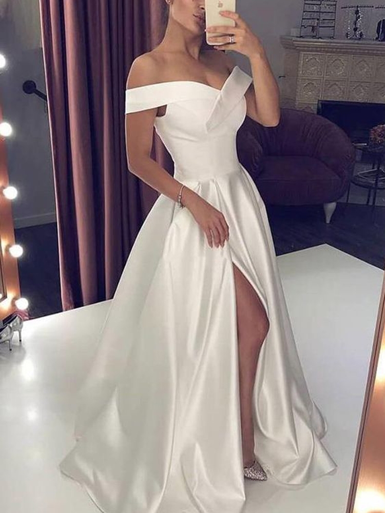 Simple Ivory V-neck Off-the-Shoulder Long Prom Dresses Slit Evening Party Dresses