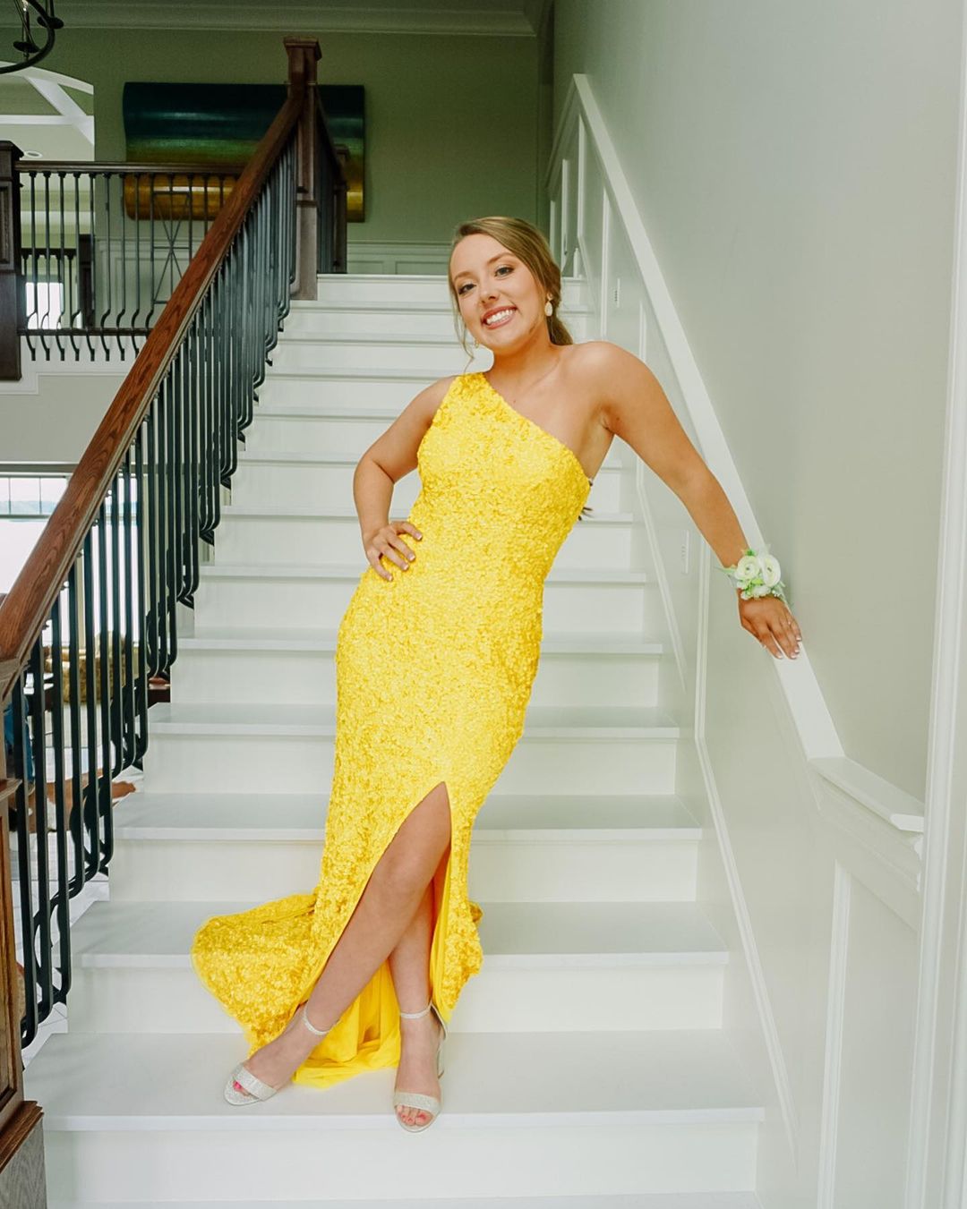 Glittering One Shoulder Mermaid Yellow Sequins Long Prom Dresses Formal Dresses Evening Dresses