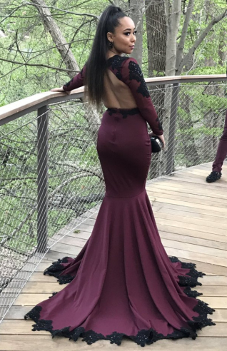 Sexy Mermaid Long Sleeves Prom Dresses Appliques Open Back Evening Dresses with Beadings