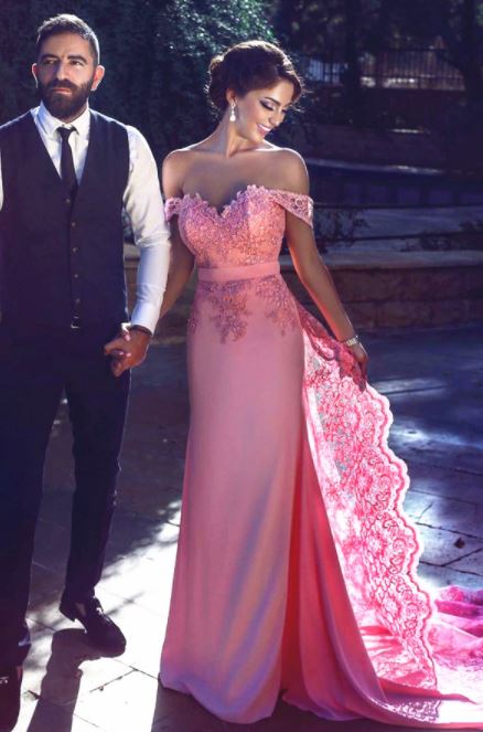 Candy Pink Lace Evening Gowns Off-the-Shoulder Long A-Line Prom Dresses