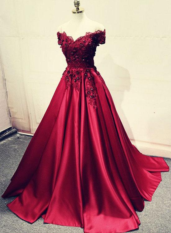 A-Line Off-Shoulder Burgundy Satin Prom/Evening Dress with Appliques
