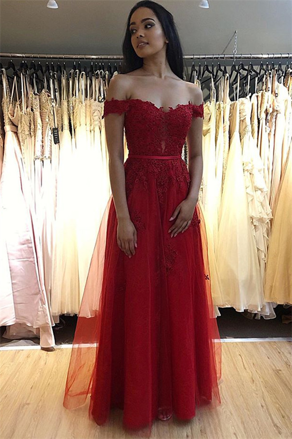 Attractive Off-the-shoulder Belted Red A-line Appliques Floor-Length Evening Dresses