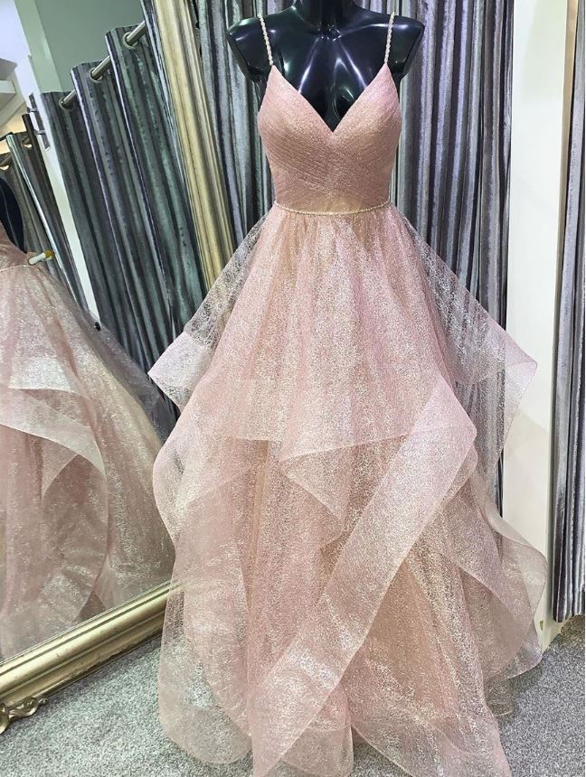 Rose Gold Pleated Long Prom Dress with Ruffles