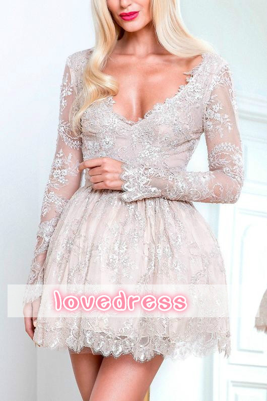 Short Long-Sleeve Champagne Lace Homecoming Dresses