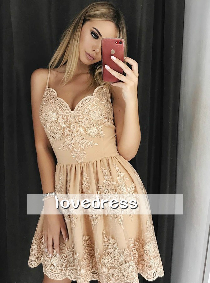 Chic Lace Appliques A-Line Homecoming Dresses Spaghetti Straps Short Cocktail Dresses