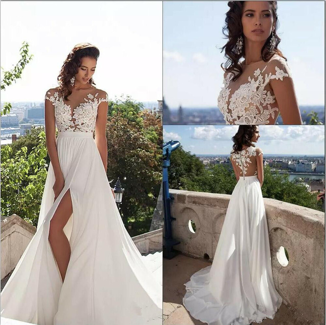 Elegant Wedding Dresses A-Line Sheer Neck Sweep Train Lace Appliques Thigh-High Slits Covered Button Beach Country Summer