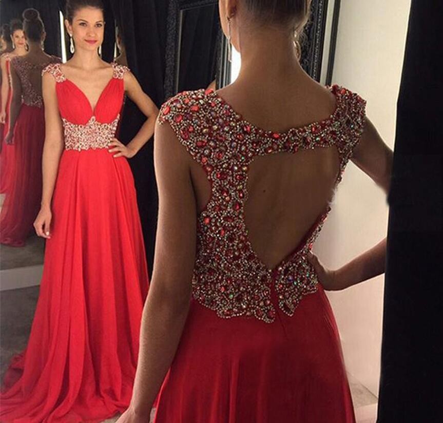 Open Back Evening Dresses A-line Cap Sleeves Chiffon Red Beaded Crystals Elegant Long Evening Gown Prom Dresses Prom Gown
