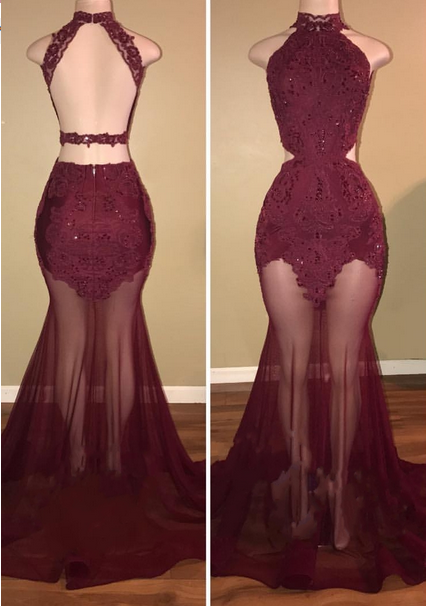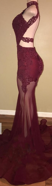 High-Neck Mermaid Burgundy Sheer-Tulle Lace-Appliques Prom Dresses