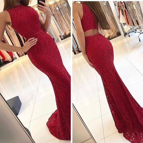 Red Elegant Mermaid Lace Sleeveless Sweep-Train Prom Dresses