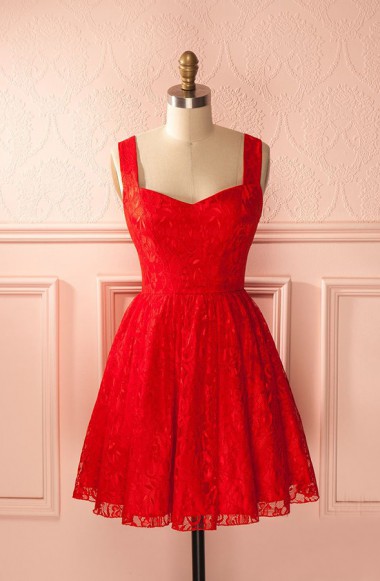 A-Line Straps Knee-Length Red Lace Homecoming Dress