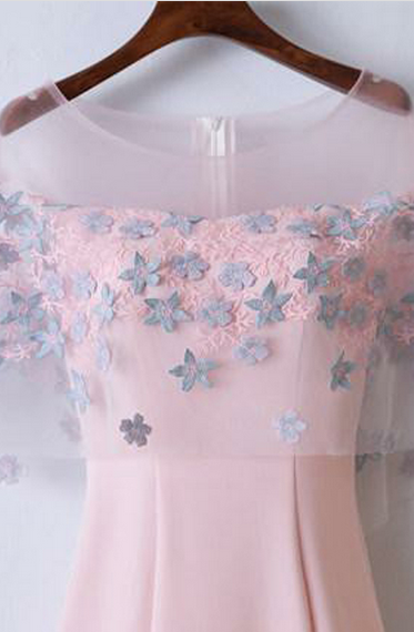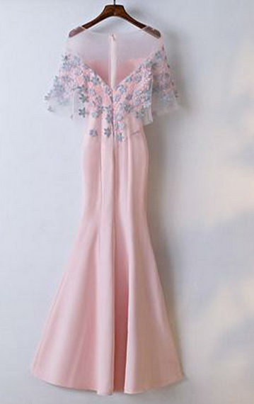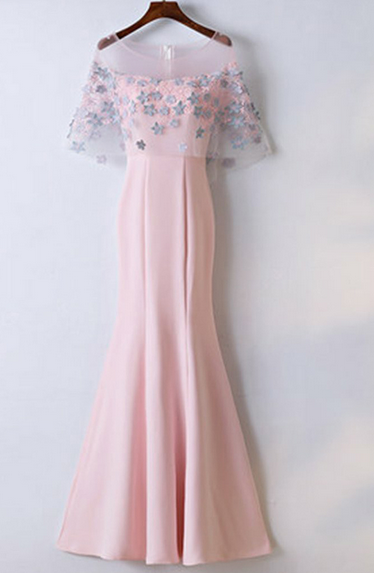 Mermaid Crew Prom Dress with Appliques Ruffles Floor-Length Pink Satin