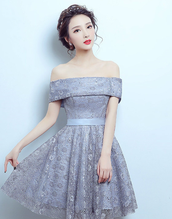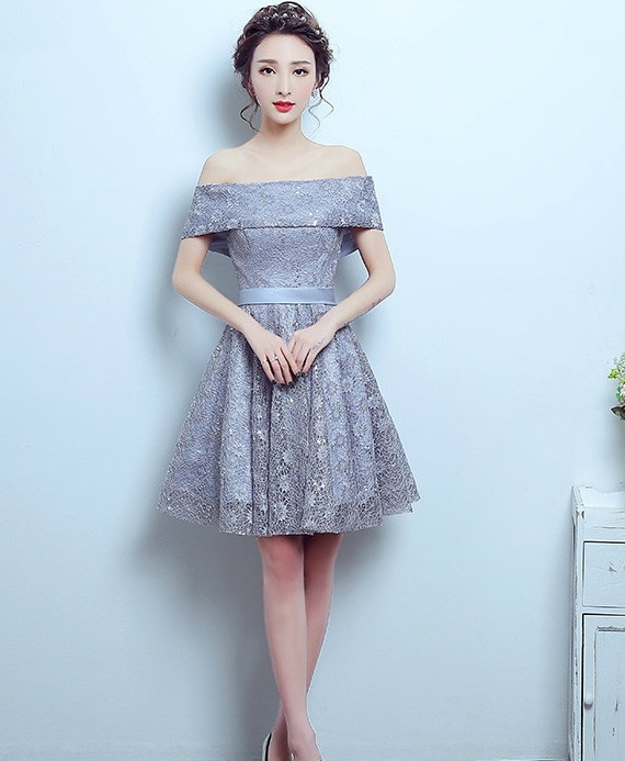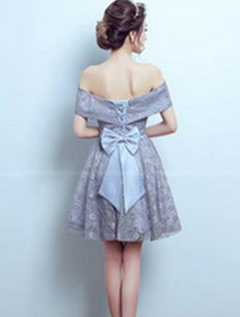 A-Line Off-the-Shoulder Bowknot Lace Sashes Knee-Length Homecoming Dress