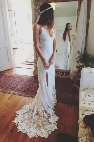 Sheath Spaghetti Straps Sweep Train Split-Side Backless Ivory Lace Wedding Dress