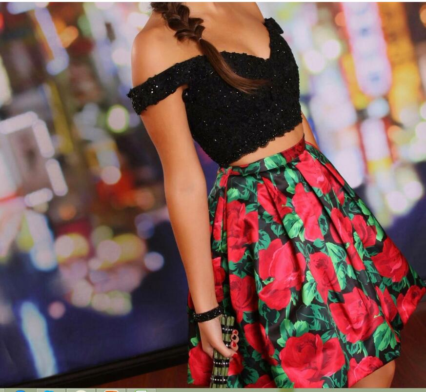 Cute Off-the-Shoulder Floral Homecoming Dresses Two Pieces Black Lace-Beaded Cocktail Dresses
