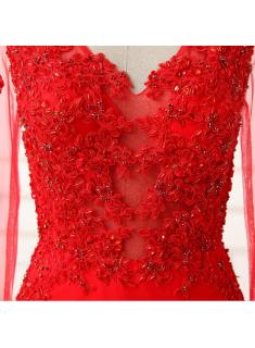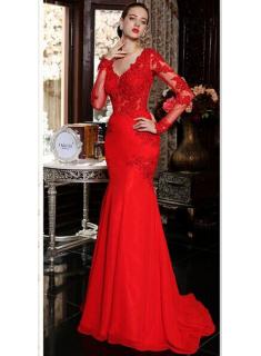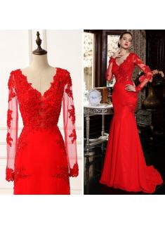 V-Neck Red Long Sleeve Beading Evening Dress Popular Chiffon Lace Sweep Train Prom Dress