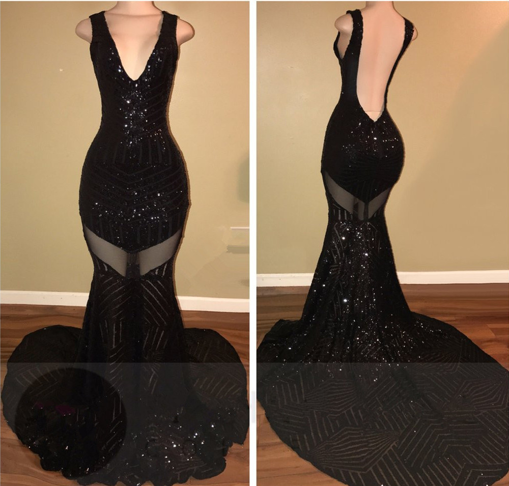 Mermaid Sexy V-neck Backless Sequined Sleeveless Black Prom Dress