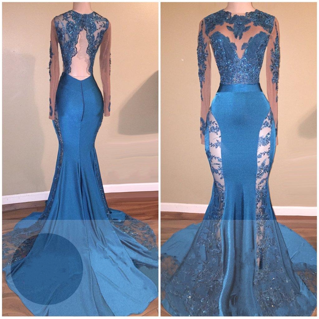 Elegant Blue Mermaid Prom Dresses Sheer Lace Long Sleeves Evening Gowns