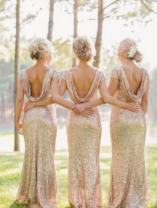 Sequins Bridesmaid Dresses Capped Sleeves Sweep Train Sexy Backless Prom Dresses