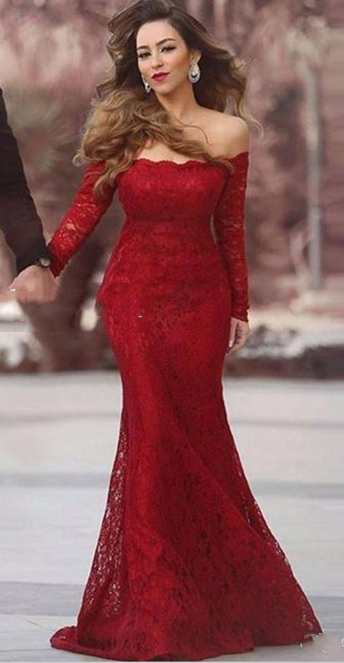 Red Lace Mermaid Prom Dress Off The Shoulder Pageant Gown Long Sleeve