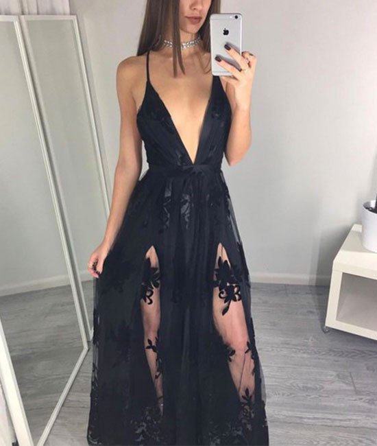 Hot Selling Deep V-neck Deep Black Lace Long Prom/Evening Dress