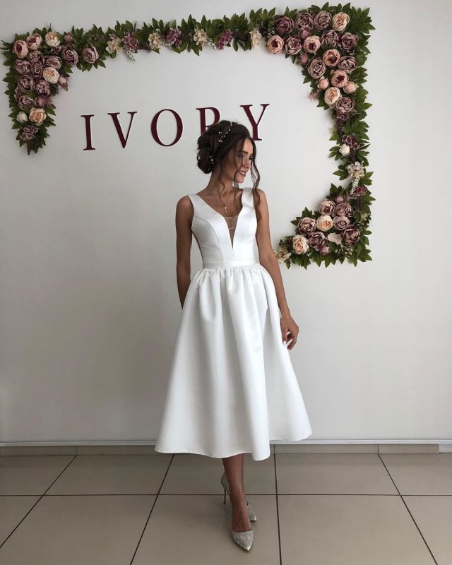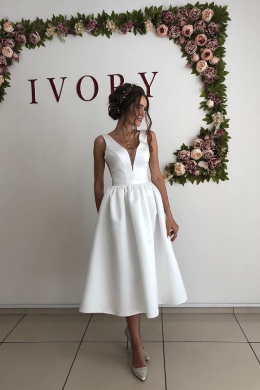 Sexy Straps V-Neck A-Line Wedding Dresses Tea Legnth Wedding Gown