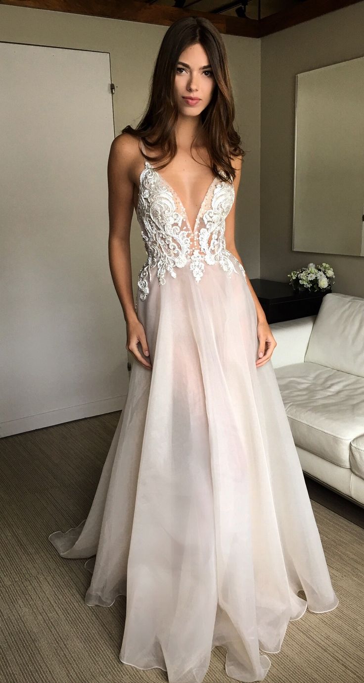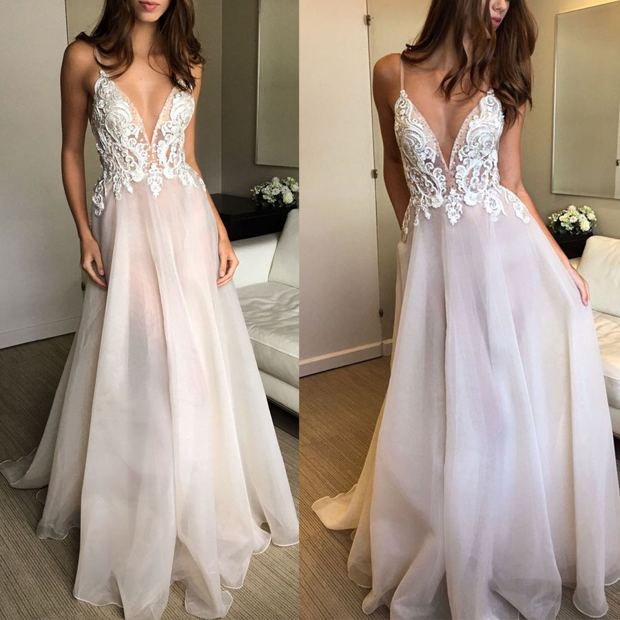 Sexy Deep A-line V-neck Lace Long Prom Dress Elegant Evening Dresses