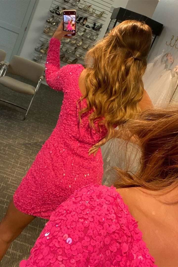 Cute Hot Pink One Shoulder Sequins Homecoming Dresses One Sleeve Short Dresses