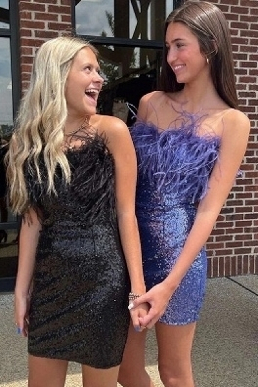 Column Homecoming Dress Short Prom Dress with Sequins and Feathers