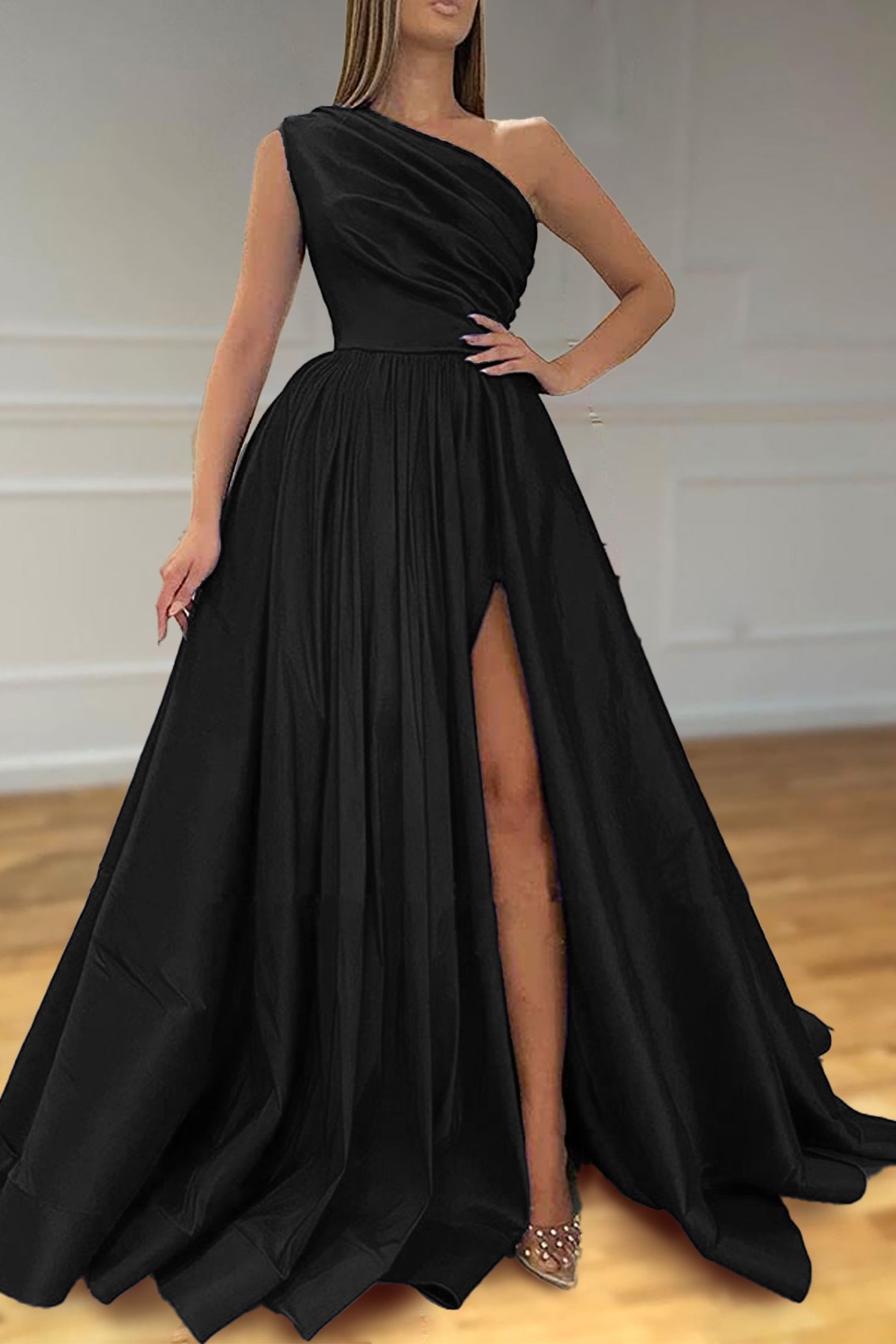 A-line One-Shoulder Satin Prom Dress With Pleated Split