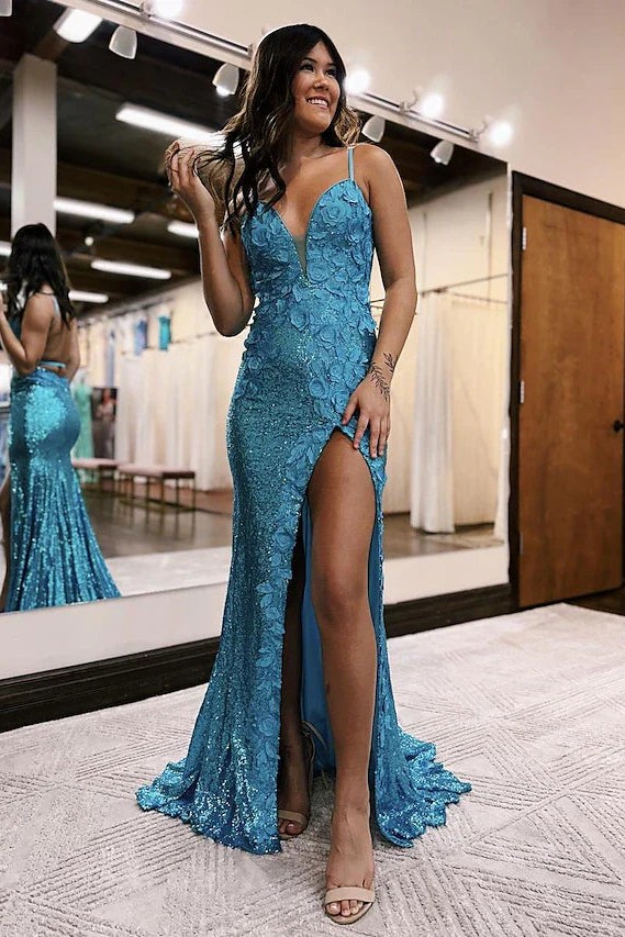 Mermaid Sleeveless V Neck Prom Dresses Dress Backless with Sequin Appliques